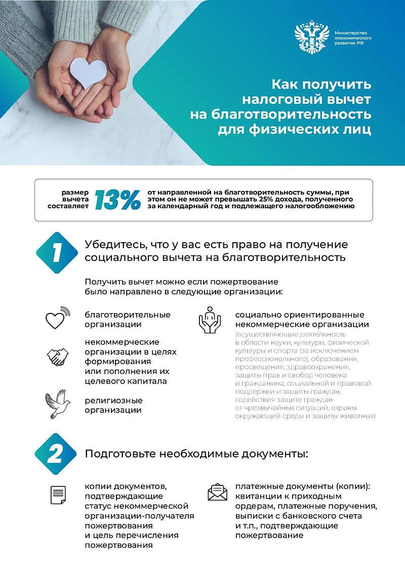 О возможности получения налоговых преференций физическими и юридическими лицами при осуществлении благотворительных пожертвований Министерство экономразвития РФ подготовило информационные материалы.